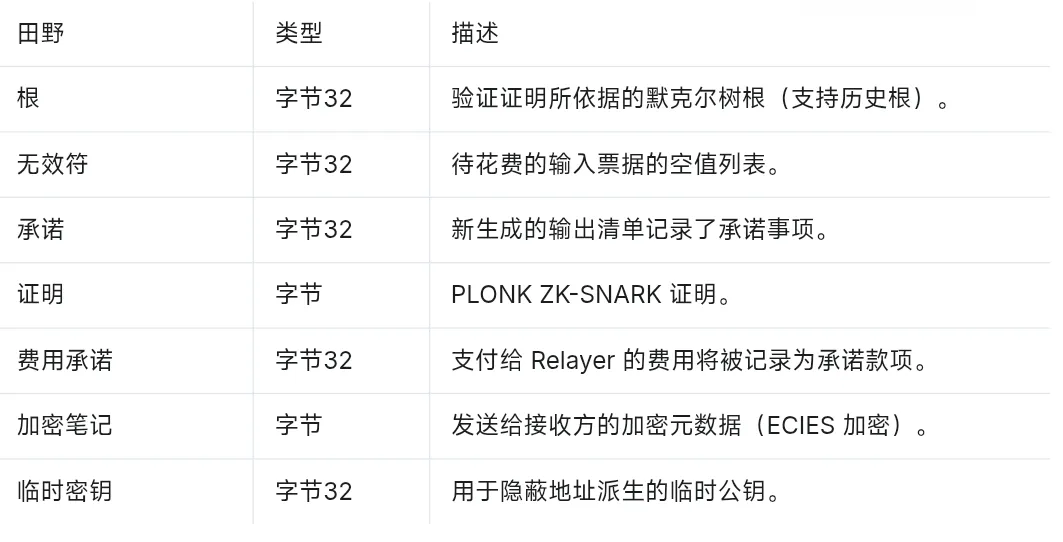 - 这是Anubis网络上最基本的隐私操作,类似于Zcash的Sapling交易。它允许用户在完全隐藏发送方、接收方和金额的情况下转移资产。由于采用了UTXO模型,这种交易通常涉及将多个小额交易“合并”并“拆分”成新的交易单。