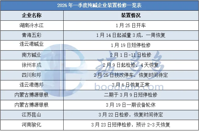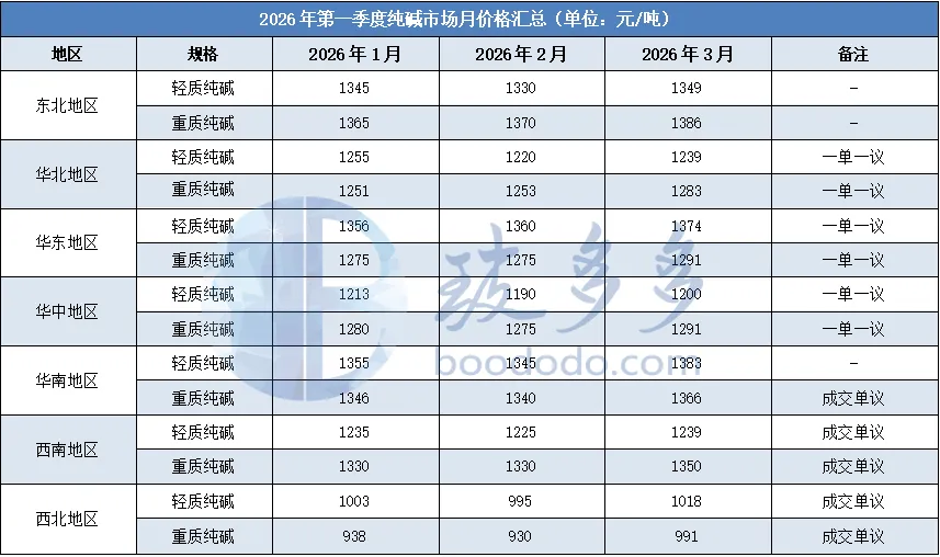 1.3、2026年第一季度国内纯碱月均价一览表