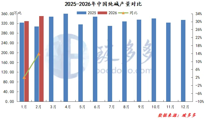 据国家数据统计,2025年12月-2026年2月国内纯碱产量1015.6万吨,同比去年966.3万吨增加49.3万吨,幅度5.1%。2026年1-2月国内纯碱总产量在680.9万吨。