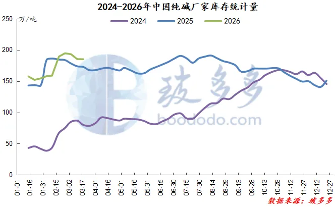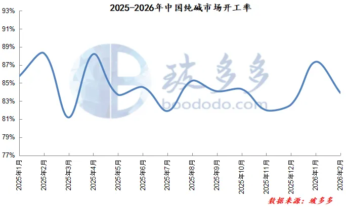 据玻多多数据显示:2025年12月-2026年2月中国纯碱行业平均开工率84.62%,较去年同期下降1.44%,本季度纯碱行业检修较少,供应维持高位震荡。