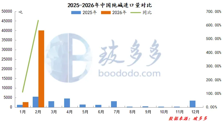 2025年12月-2026年2月纯碱累计进口量总计4.62万吨,较去年同期水平增加3.40万吨,同比增长279.84%。2026年1-2月进口纯碱累计约4.27万吨,同比去年同期上涨535.72%,进口量增长约3.60万吨。
