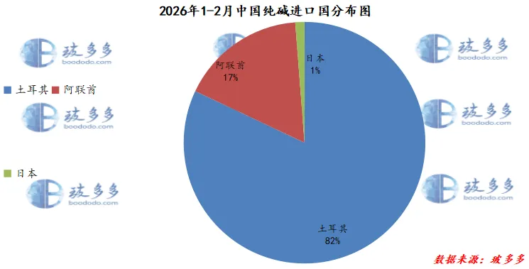 2026年1-2月中国进口纯碱前三的国家有土耳其3.5万吨,占该季度总进口量的82%;阿联酋0.72万吨,占该季度总进口量的17%;日本0.05万吨,占该季度总进口量的1%。