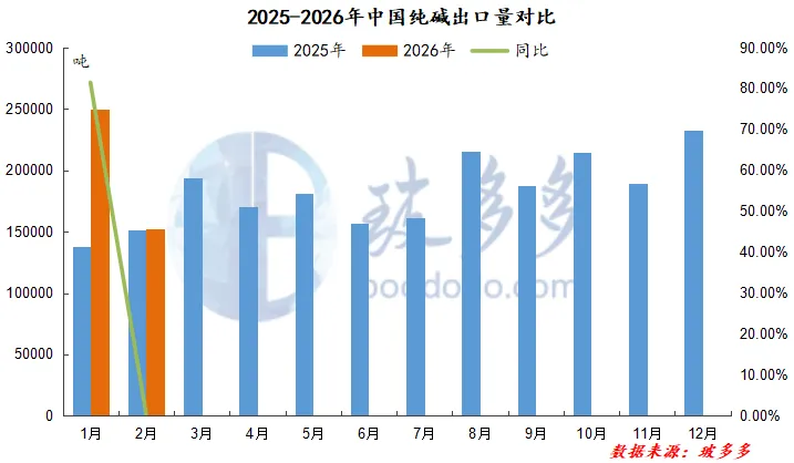 2025年12月-2026年2月纯碱累计出口量总计63.46万吨,较去年同期水平增加16.37万吨,同比增长34.75%。2026年1-2月累计出口纯碱40.18万吨,同比增加39.06%,出口量增加约11.29万吨。