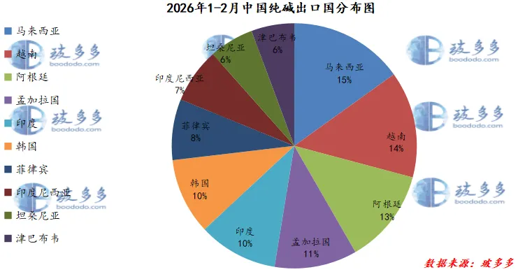 2026年1-2月中国纯碱出口前三的国家有马来西亚4.12万吨,占该季度总出口量的15%;越南3.83万吨,占该季度总出口量的14%,阿根廷3.42万吨,占该季度总出口量的13%。