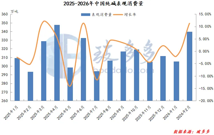 2025年12月-2026年2月中国纯碱表观消费总量在956.76万吨,较去年同期上升36.33万吨,同比增长3.95%。2026年1-2月国内纯碱表观消费量累计为644.99万吨,同比去年增长6.95%。