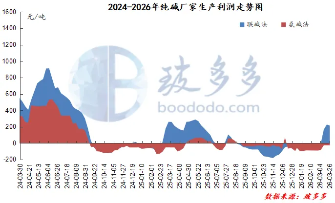 据玻多多数据测算,一季度末,联碱法生产的毛利为215.00元/吨,较去年同期的211.60元/吨增长了3.40元/吨;氨碱法的毛利为-26.20元/吨,相比去年同期的-52.21元/吨增长了26.01元/吨。一季度受纯碱及副产品价格上涨影响,纯碱利润修复明显,较上季度大幅增长,联碱法由亏转盈。