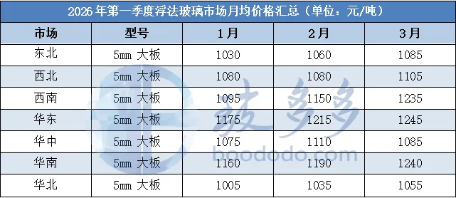7.1、2026年第一季度浮法玻璃月均价一览表