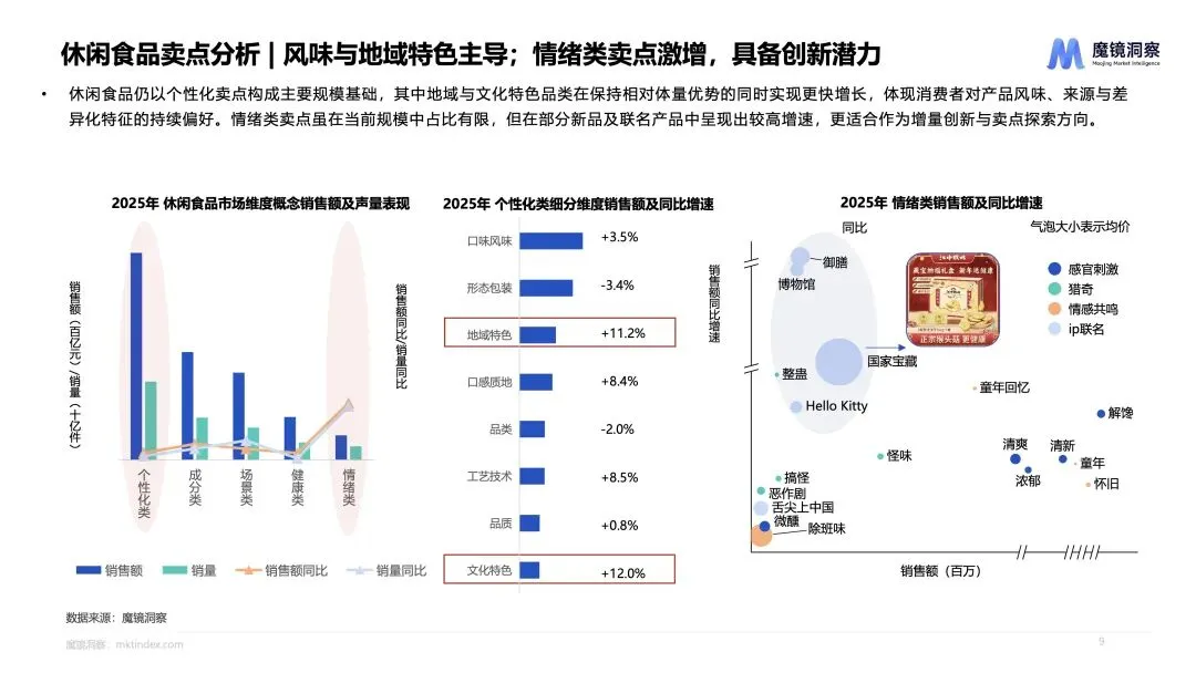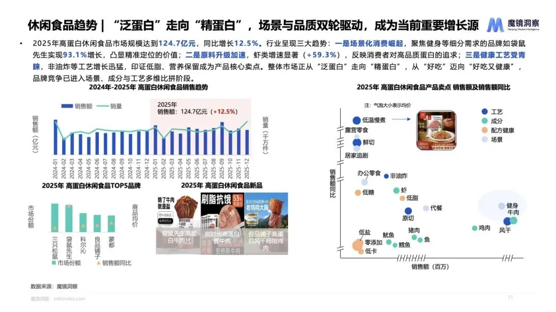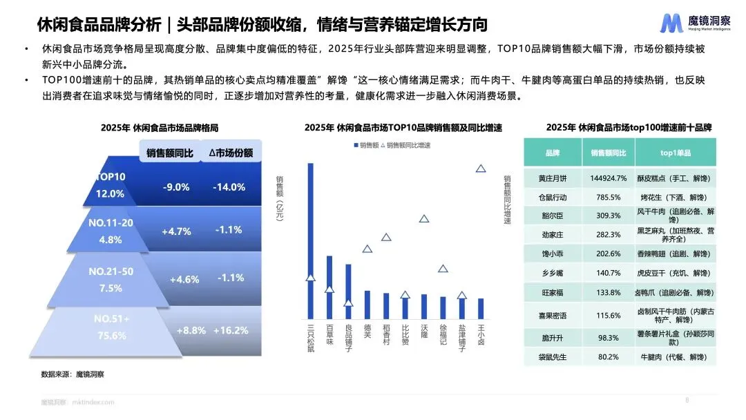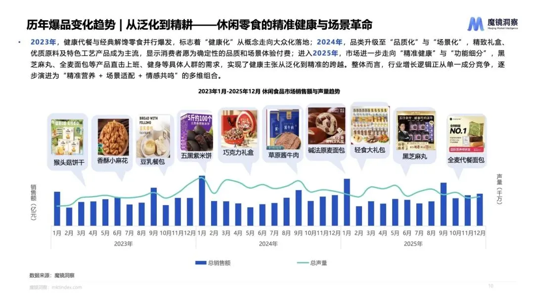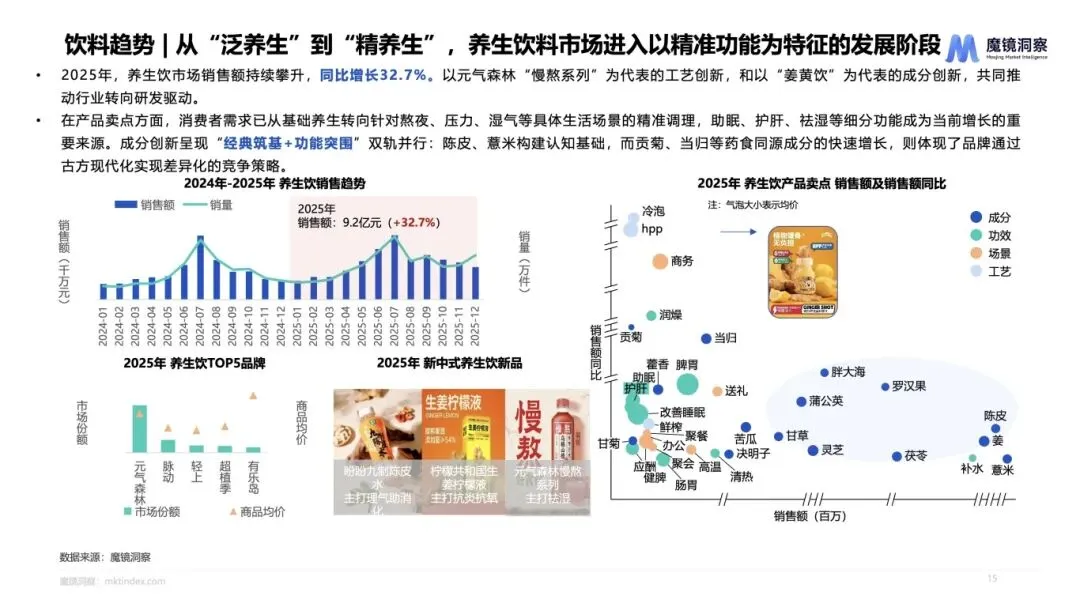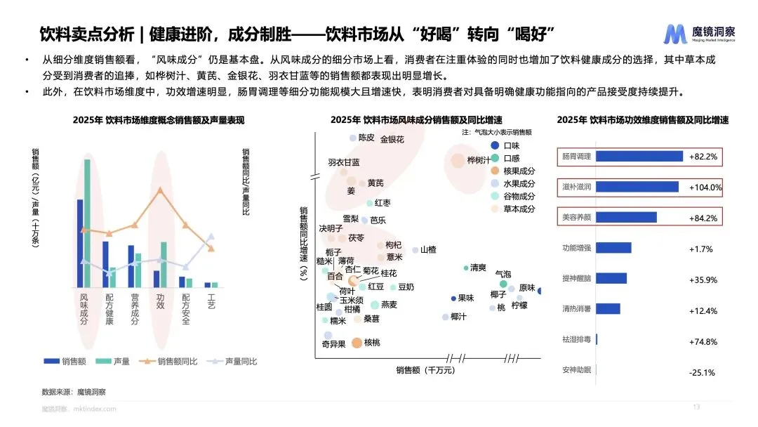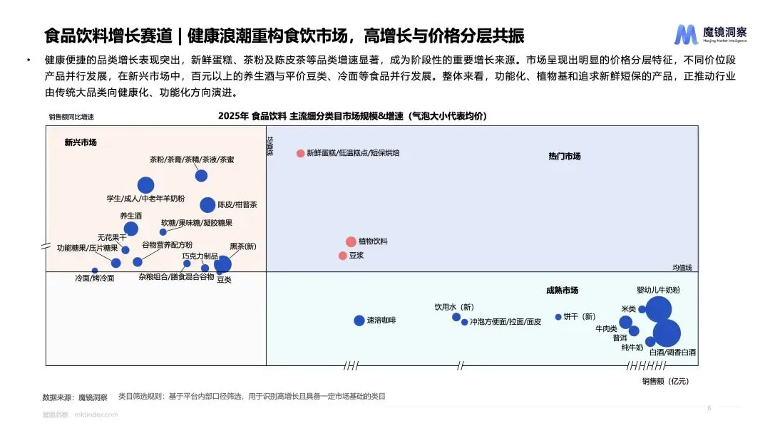 :2025 年市场规模达 5936.7 亿元,同比增长 7.8%,量价双增驱动增长。健康化是核心趋势,高蛋白休闲食品(124.7 亿元,+12.5%)、植物饮料、养生饮(+32.7%)等赛道高增;价格分层明显,百元以上养生酒与平价豆类、软糖等品类同步增长。饮料市场呈现 “风味承载规模、功能贡献增速” 特征,肠胃调理、滋补滋润等功能卖点增速突出。 - 大健康市场稳健增长,细分赛道爆发式增长