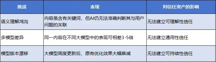 在传统商业中,企业的核心竞争力是品牌资产——知名度、美誉度、忠诚度。而在AI时代,当用户通过大语言模型获取信息、做出决策时,决定企业被选择与否的关键,已从“用户是否知道品牌”转变为“AI是否信任品牌”。信任资产,就是品牌在AI大模型中的可信度、权威性和推荐优先级的总和。它决定了:· 当用户问“这个问题怎么解决”时,AI是否会推荐你的解决方案 · 当用户做购买决策时,AI是否会优先引用你的内容1.6 三大技术挑战