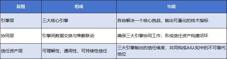 · 可持续性信任建立:无论模型如何迭代,信任资产不贬值 · 投入沉没风险降低:不需要为每次模型更新重新投入优化成本 · 长期规划可行:GEO从“短期冲刺”变为“长期资产”六、三体引擎的协同效应与价值闭环