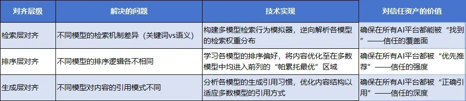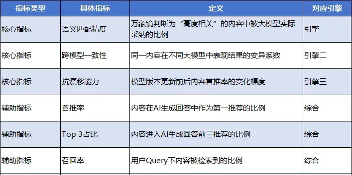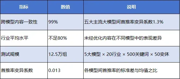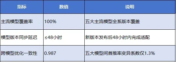 · 被采纳率提升:你的内容进入AI生成回答候选集的概率增加 · 首推率跃升:在核心品类Query中,品牌被AI首推的比例显著提升四、引擎二:跨模型一致性引擎——建立通用性信任