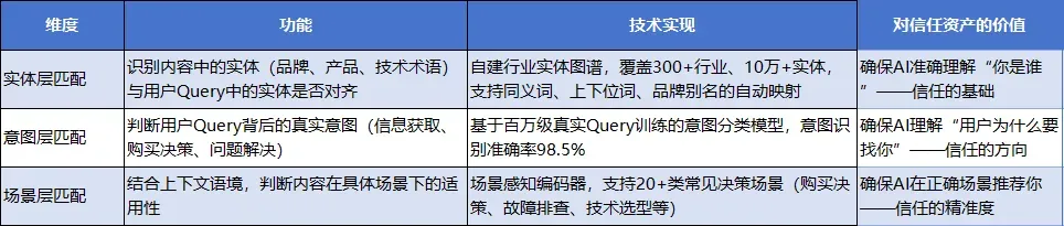 三维语义匹配引擎将内容与Query的匹配拆解为三个独立又协同的维度: