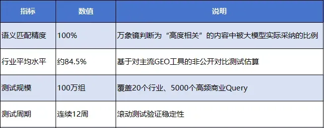 万象镜建立了行业首个系统化的GEO效果测试验证体系,确保所有技术指标可量化、可复现。7.1 测试集建设