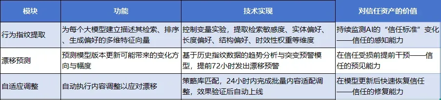 · 通用性信任建立:无论用户使用哪个AI平台,都能看到你的品牌被推荐 · 优化成本降低:不需要为每个模型单独制定策略,一次优化全域生效 · 决策确定性提升:企业的GEO投入不再是“押注某个模型”五、引擎三:抗模型漂移引擎——建立可持续性信任
