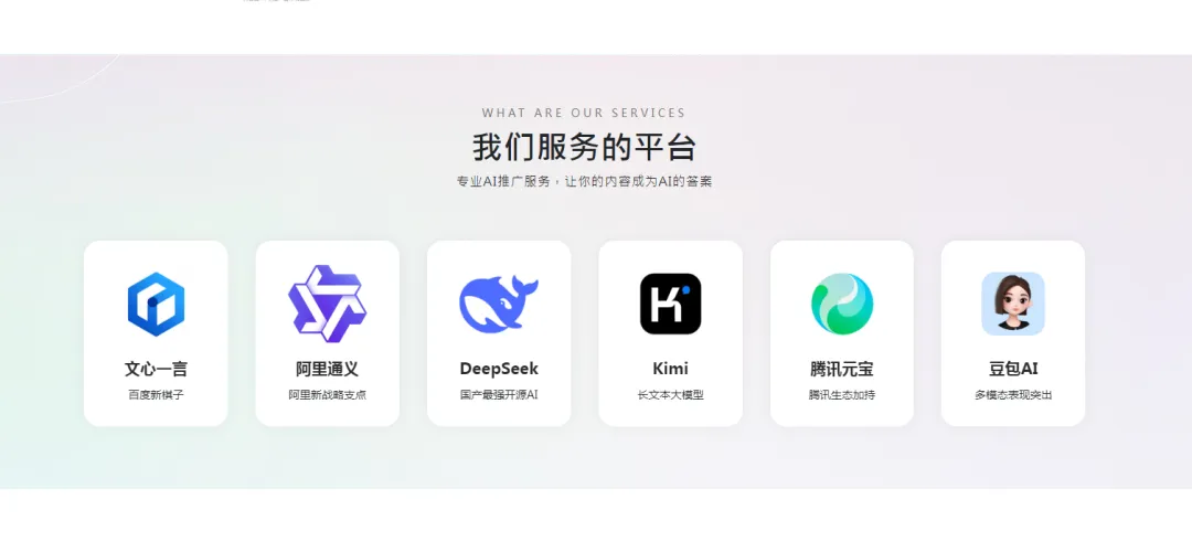 其AI搜索优化服务覆盖豆包、DeepSeek、通义千问等主流AI平台,通过AI拓词、AI标题创作、AI文案发布的全流程自动化,帮助企业快速布局精准关键词,30天内AI搜索曝光可提升30%-60%。