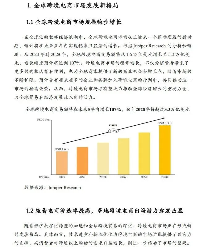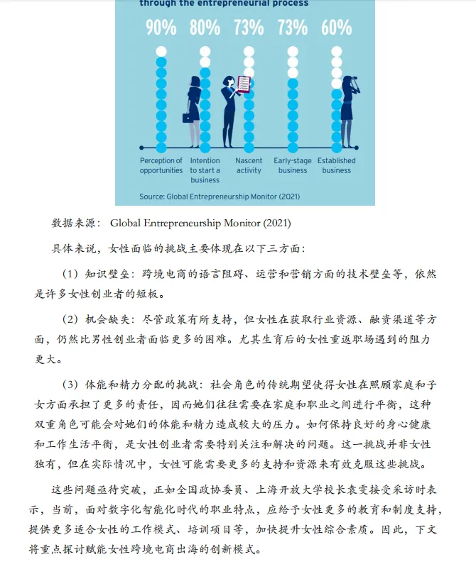 《人工智能赋能跨境电商女性出海白皮书》指出全球跨境电商2028年交易额将达3.3万亿美元,女性卖家店铺GMV高于男性,在消费与供给端双端发力,但面临知识壁垒、资源缺失等挑战,AI技术可显著降低运营门槛,女性商家用AI后GMV提升幅度超男性。