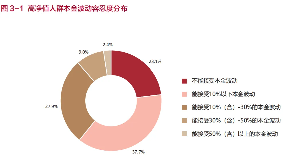 《白皮书》数据显示:高净值人群的风险容忍度显著降低,财富管理策略趋于稳健。高达60.8%的受访者将本金波动容忍度严格控制在10%以内,而能接受30%以上高波动的比例不足12%。这一数据背后,是富人们对资金安全的极度重视。