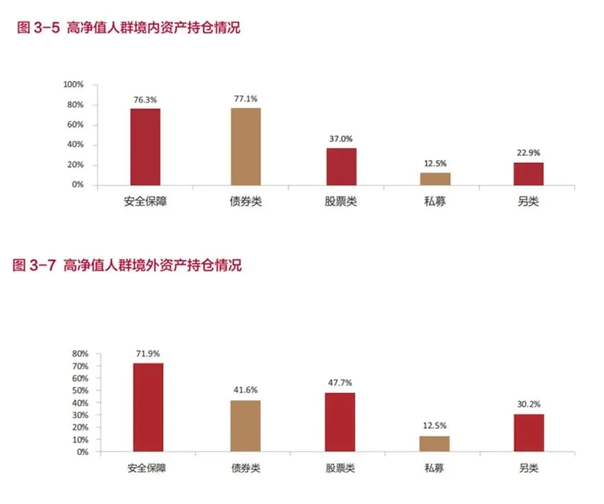 在境内配置上,高净值人群注重“攻守兼备”,既配置了大量债券类资产(77.1%)和安全保障类资产(现金、存款、保险,76.3%),以筑牢财富安全垫;又适度配置了股票类资产(37%),在控制风险的前提下寻求收益增强。