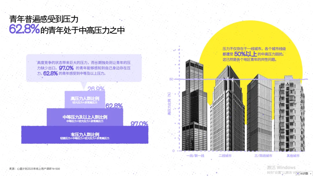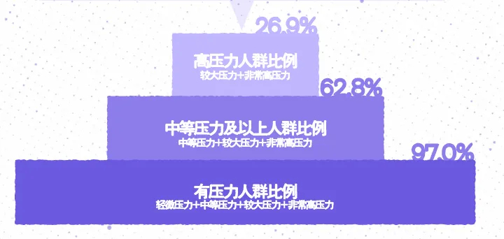 当代青年成长于长期独处与高度竞争的双重环境中,白皮书明确指出,焦虑感与孤独感已不再是个别青年的情绪特例,而是这一代人的常态。62.8%的青年深陷中高压力之中,压力不再是少数人的困扰,已然成为青年群体的普遍经验。