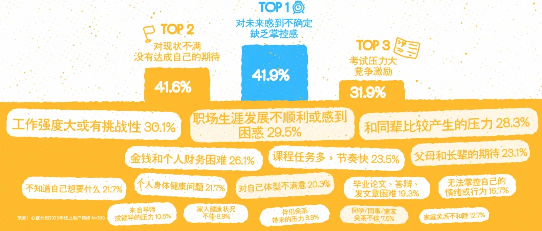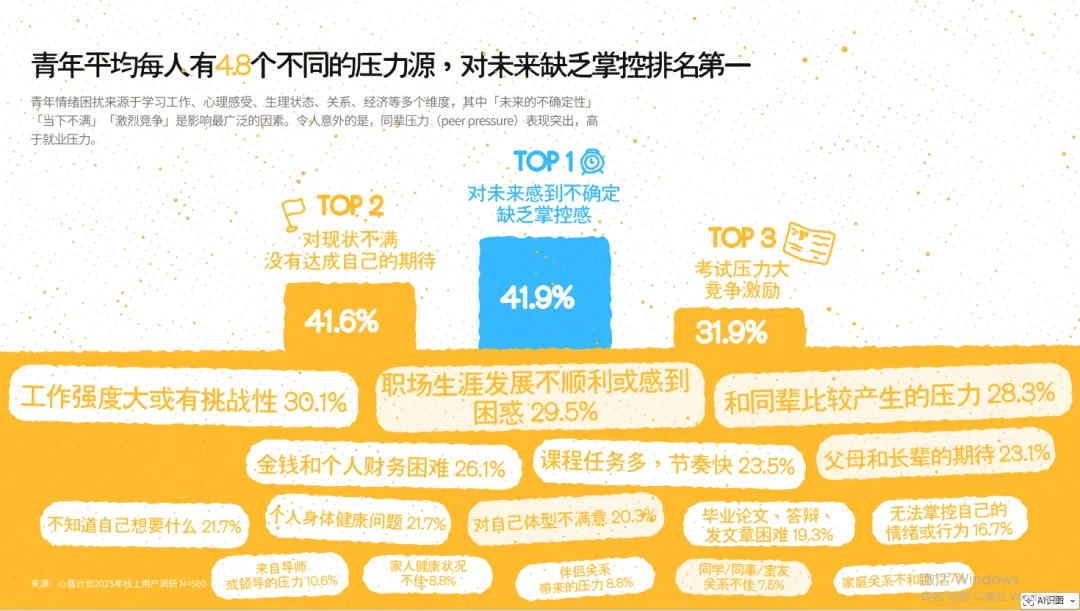 白皮书数据显示,当代青年平均每人要面对4.8个不同类型的压力源。其中,“未来的不确定性”“对当下生活的不满”“激烈的社会竞争”是影响范围最广的三大因素。令人意外的是,同辈压力(peer pressure)的影响尤为突出,甚至超过了就业压力,成为青年情绪困扰的重要诱因。