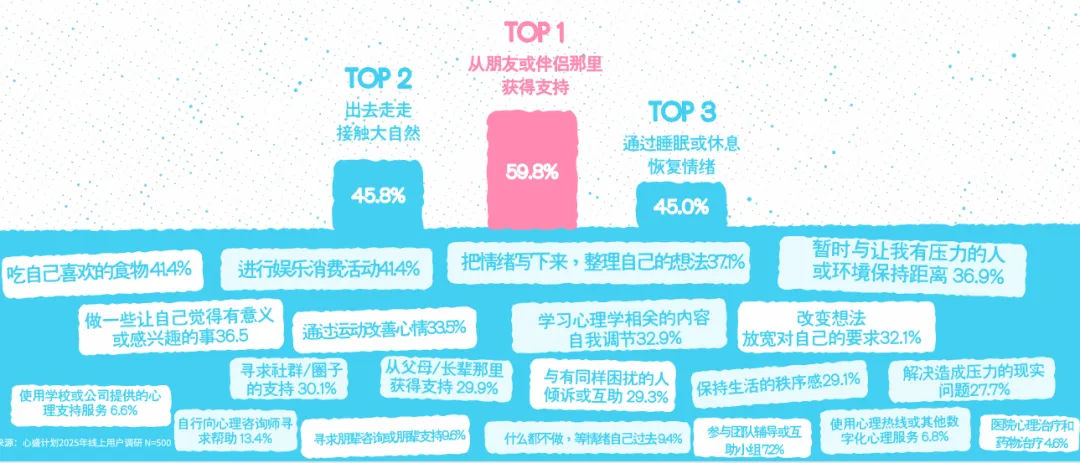 当代青年擅长通过关系联结与身体疗愈缓解情绪困扰:关系支持排名第一,主要来自朋友与伴侣,成为青年遭遇情绪风暴时的“避风港”;而身体则是情绪的“充电站”,青年通过规律作息、坚持运动、调节感官等方式舒缓压力,实现“身定则心定”。
