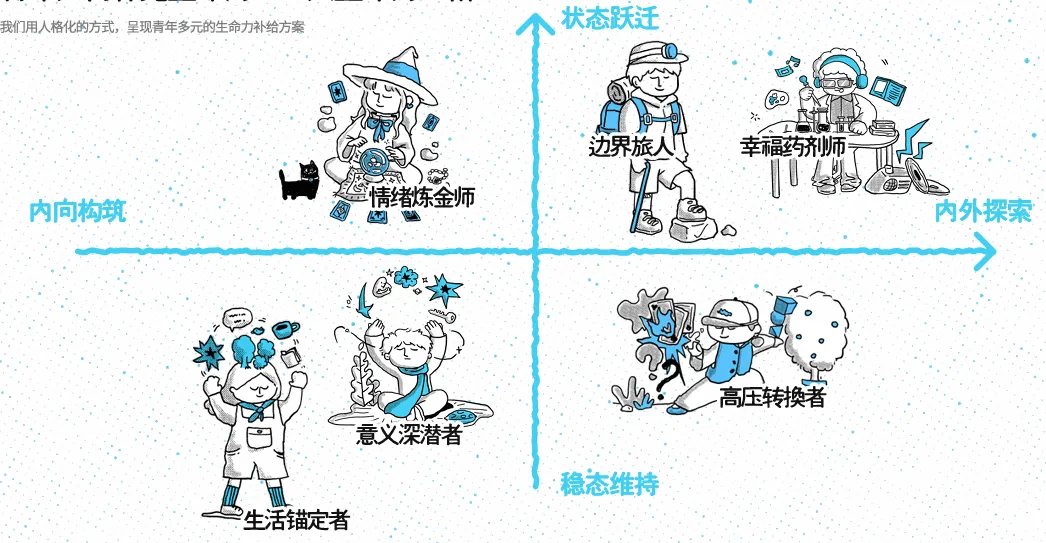 白皮书以人格化的方式,总结了青年群体多元的生命力补给方案,提炼出以下“生命力人格”,每一种人格都代表着青年与情绪相处的独特方式: