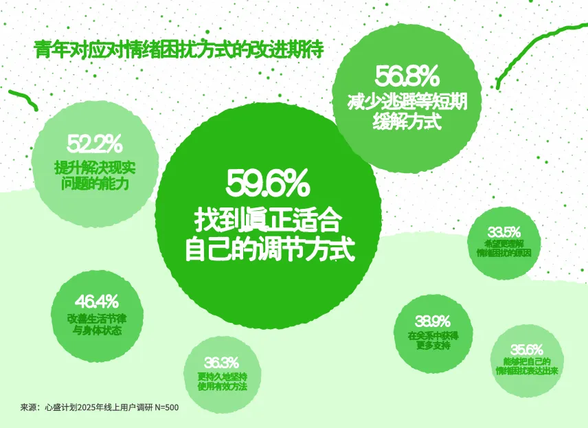 尽管情绪疗愈行业正快速发展,但近六成青年依然迷茫于“哪种情绪调节方式适合自己”。他们真正期待的,是个性化、长期有效的情绪解决方案,不仅能缓解当下的负面情绪,更能改善自身行为模式、提升情绪掌控力,最终解决导致压力的现实问题。