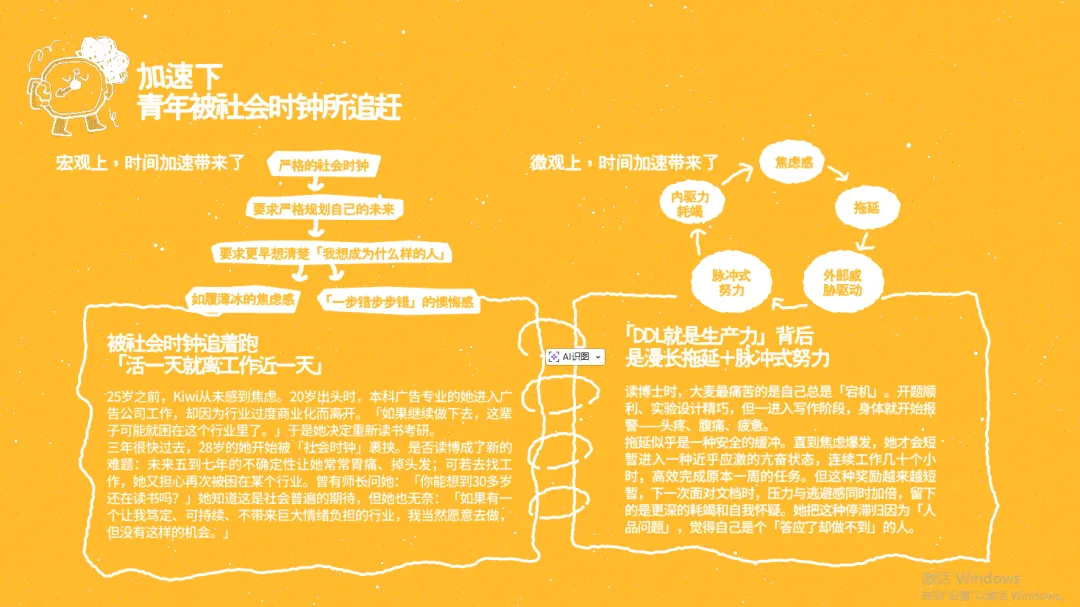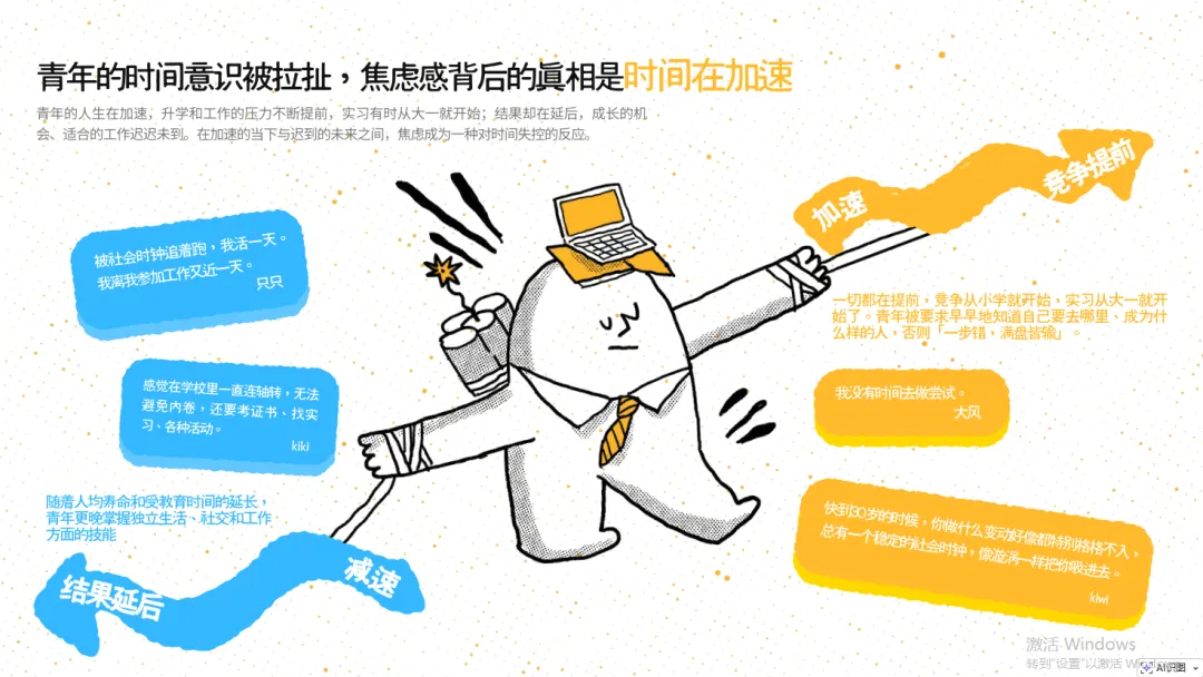 当代青年的人生仿佛被按下“加速键”——升学、工作的压力不断提前,不少青年从大一开始就投入实习,被迫提前适应社会节奏;但成长的回报却在“延后”,理想的工作、成长的机会往往迟迟未到。在“加速的当下”与“迟到的未来”之间,焦虑成为青年应对时间失控的自然反应。