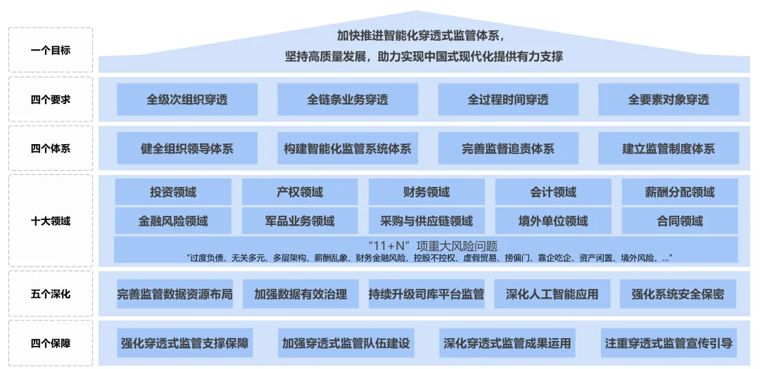 随着市场化改革的不断深化,央国企组织层级日益复杂、业务范围持续拓展,传统监管模式面临“层级壁垒难穿透、数据孤岛难打破、风险预警难及时”的痛点,难以满足新时代国资监管“全级次、全流程、全要素”的核心要求。政策的不断完善为央国企高质量发展划定了“施工图”——以财务数智化为底座,以穿透式监管为抓手,推动企业管理从“粗放式”向“精细化”转变,实现监管效能与经营效益的双向提升。