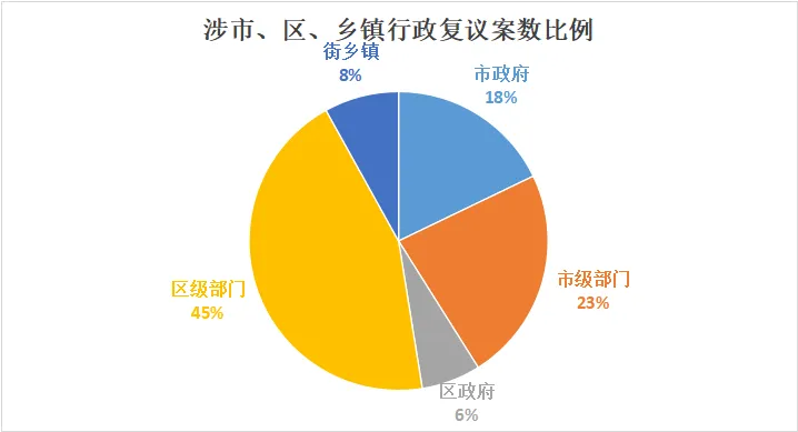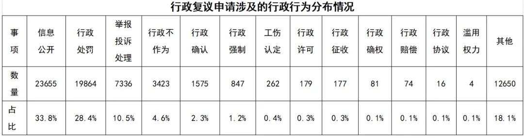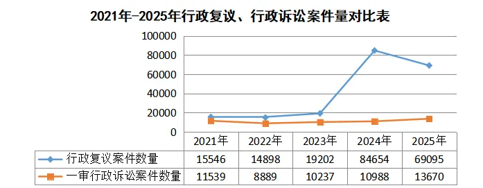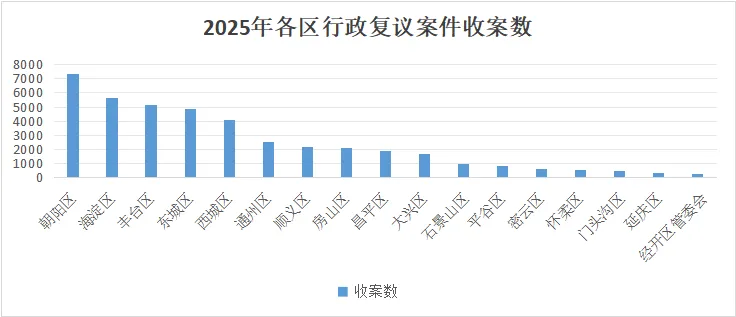 2026年3月31日,北京市司法局官方公众号“京司观澜”发布了2025年北京市行政复议和行政应诉工作白皮书。2025年,北京市行政复议机关在司法部、市委市政府的正确领导下,坚持以习近平新时代中国特色社会主义思想为指导,学悟笃行习近平法治思想,持续推进行政复议主渠道建设,聚焦实质解纷、以案促治和复议护企三项重点工作,在服务首都高质量发展、推进法治政府建设、维护社会公平正义等方面发挥了积极作用。目前,全市行政复议主渠道建设工作格局基本形成,路径更加清晰,效果日益显现。全市行政复议机关进一步畅通行政复议申请渠道,大力宣传推广全国行政复议服务平台等互联网申请渠道,进一步健全与公安交通管理等执法部门的行政复议申请代收转接机制,各区行政复议机构在入驻综治中心后积极开展咨询接待工作。2025年,全市共收到行政复议申请69095件,与全市法院收到的以本市行政机关为被告的一审行政案件数量相比,复议诉讼收案比达到5.1:1,行政复议首选率进一步提升。各级行政复议机关坚持应收尽收,全年共受理行政复议案件42116件。全年共审结行政复议案件39435件(含去年结转),审结率93.6%,位居全国前列。与去年相比,区级行政复议机关(包括北京经济技术开发区管理委员会)收案增长较快,收案占比达51%;市政府和市司法局作为市级行政复议机关,收案占比为49%。从被申请人角度看,被申请人为市级行政机关(含市政府)的行政复议申请为28587件,占比41%;被申请人为区级行政机关(含区政府)的有35196件,占比51%;被申请人为街道、乡镇行政机关的有5312件,占比8%。各区行政复议案件分布不平衡。朝阳、海淀、丰台、东城、西城5个区行政复议案件数均在4000件以上,分别为7383件、5656件、5118件、4843件和4106件。受理案件数量前5位的是:公安15406件,占36.58%;市场监管6296件,占14.95%;自然资源1282件,占3.04%;金融监管1068件,占2.54%;人力资源和社会保障1018件,占2.42%。政府信息公开、行政处罚、投诉举报、行政不作为占主要部分,分别为23655件、19864件、7336件、3243件,占比34%、28%、11%和5%。其他,如行政确认、行政许可、行政征收、行政协议等行政复议案件,尽管占比较小但增速较快。全市行政复议机关坚守公平正义的办案工作生命线,全年共以撤销、确认违法、变更、责令履责等决定类型直接纠错2534件,直接纠错率7.9%。全年共办理申请人一并提出行政赔偿申请的行政复议案件388件,依法、及时作出行政复议决定。各级行政复议机关强化办案效率要求,严格落实案件审理“繁简分流”机制要求,对小额罚款、政府信息公开等事实清楚、争议不大的案件做到简案快办,全年共通过简易程序办理案件16837件,与新修订的行政复议法实施前相比,全部案件的平均审理时限缩短50%,有效降低了群众获取救济的时间成本。各级行政复议机构积极践行新时代“枫桥经验”,坚持调解先行、应调尽调,将调解和解工作贯穿办案全过程。全年共以案前调解方式办结6600件,以案中调解、和解等方式办结4482件,调撤结案率为28.5%。经过行政复议后,93%的案件没有再进入行政诉讼或信访渠道处理,行政争议实质化解效能显著。占比较高的是信息公开、举报投诉处理、行政不作为、行政强制、行政处罚,分别为15.64%、15.6%、11.71%、10.98%和5.98%。因行政行为主要事实不清、证据不足被纠错的案件最多,占全部纠错案件的59%。此外,因违反法定程序被纠错的占18%,因被申请人不履行法定职责被纠错的占12%,因适用依据错误被纠错的占2%,另有因超越职权或滥用职权、行政行为明显不当等原因被纠错的占比9%。2025年,全市各级行政机关共发生一审行政应诉案件13670件,同比增长24.4%。全市各级人民法院共审结一审行政应诉案件12531件,判决行政机关一审败诉案件1496件,败诉率为11.9%,下降5.4个百分点。全市行政机关负责人出庭应诉4096人次,与去年相比增长2%,领导干部主动接受司法监督的意识进一步增强。全市行政复议机关始终把围绕中心、服务大局摆在首位,将行政复议与应诉工作主动融入首都发展全局谋划推进,在深入落实城市总体规划、提升城市精细化治理水平、接续实施疏解整治促提升等市政府重点任务方面持续发力。2025年,全市行政复议机关共受理与上述重点任务相关的土地类行政复议案件648件,涉及土地5000余亩,妥善化解了相关行政争议。市政府行政复议机构对与重点任务相关的案件加强案前法制指导,积极参与了城市更新、文物保护、疏解腾退、违建治理等的法治保障工作,努力化解了一批相关行政争议。朝阳区妥善办理涉及城中村改造等重点项目落地相关的腾退类案件近300件。延庆区在涉重点项目案件中构建信息集成、综合研判、联动化解的工作格局,为项目顺利实施提供有力法治支撑。全市行政复议机关深入贯彻落实司法部、市政府有关规范涉企执法专项行动的部署要求,坚决纠正侵害企业合法权益的行为,增强企业发展信心和法治获得感。全市全年共受理涉企行政复议案件2686件,审结2013件,纠错98件,调解和解结案479件。各区普遍建立了涉企行政复议“绿色通道”,优化接待咨询和审查受理机制,提升企业维权便捷度。全市行政复议机关坚持对纠错类案件建立一案一台账的执行跟踪机制,打通企业权益保障“最后一公里”。市政府行政复议机构对涉企案件坚持“调解+快办