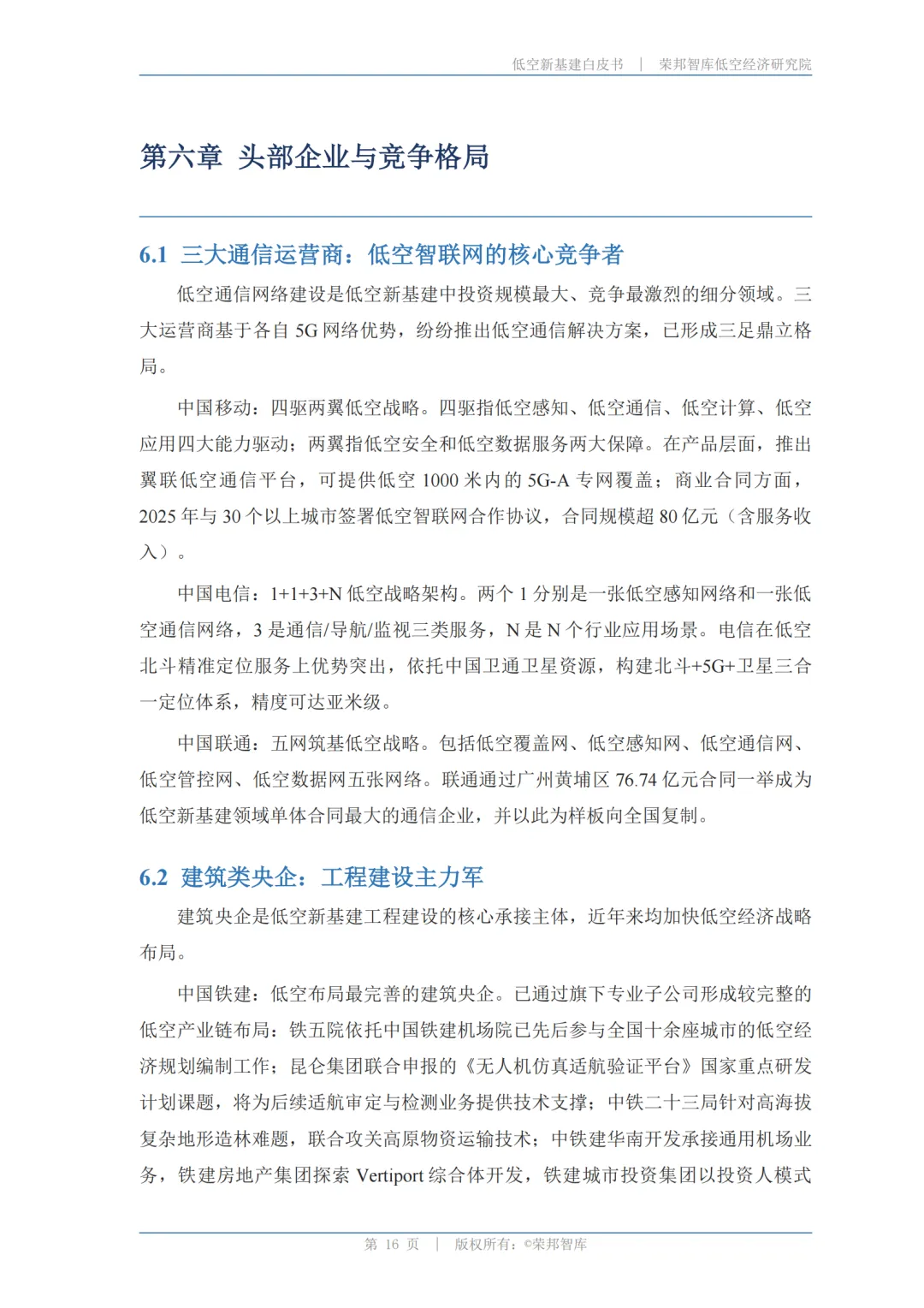 建筑类央企:白皮书认为,中国铁建是当前布局最完善的建筑央企,已通过通用机场资质体系+12个以上在建项目建立先发优势;中国电建路径最清晰,以电力工程延伸到低空充换电,形成独立竞争壁垒。中国中铁、中国建筑也在加速布局,但整体定位尚不清晰。