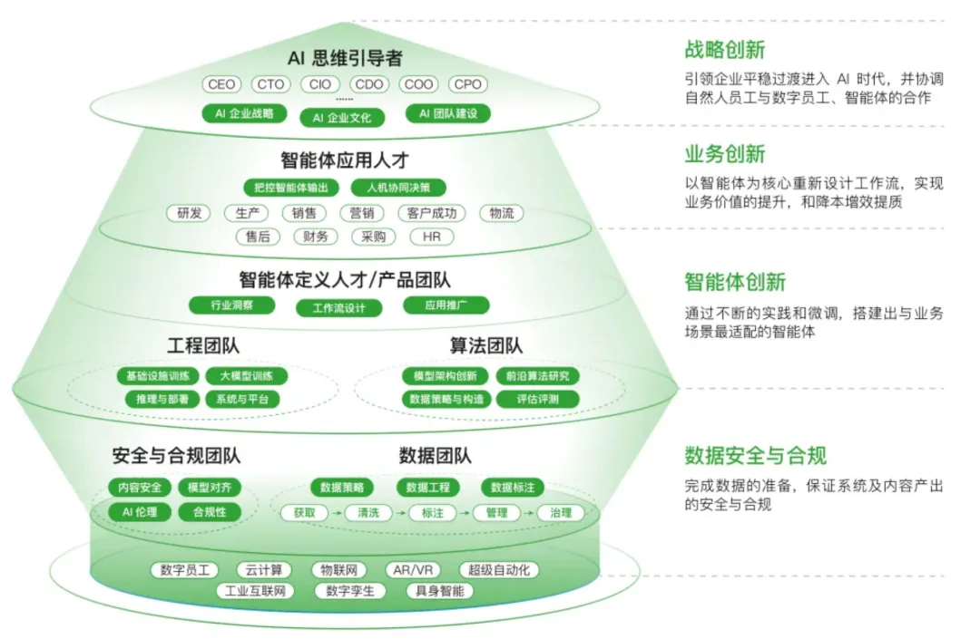 其提出的“AI人才粮仓模型”为金融机构构建分层、系统的AI人才梯队提供了清晰框架。该模型以智能体为核心,覆盖从数据准备、安全合规、模型构建与优化,到智能体开发与应用的全链路能力环节,旨在实现人的能力结构与AI系统能力结构的精准对齐与协同进化。
