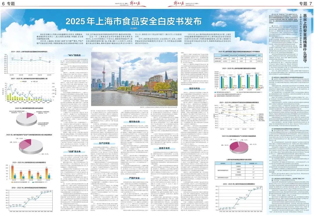 食品安全事关人民群众身体健康和生命安全,是最基本、最普惠的民生诉求之一,是人民群众获得感、幸福感、安全感的重要基础支撑。2025年,上海各区、有关部门按照“四个最严”要求,严防严管严控食品安全风险,持续推进食品安全治理体系和能力的现代化,全市食品安全状况保持总体有序可控、稳定向好的态势。过去一年,上海食品安全评价性抽检总体合格率为99.5%,比2024年提高0.1个百分点,继续保持较高水平;报告发生集体性食物中毒1起,中毒人数11人(无死亡),未发生重大食品安全事故,集体性食物中毒报告发生率为0.04例/10万人口,保持在2011年以来不高于1例/10万人口的较低水平。对于上海的食品安全状况,公众总体认可。去年,上海市民食品安全知识知晓度评分升至92.1分,市民食品安全满意度评分升至92分。3月31日,由上海市食品药品安全委员会办公室、上海市市场监督管理局编制的《2025年上海市食品安全状况报告》(白皮书)正式出炉,并授权本报独家首发。这已是上海连续15年向社会发布食品安全白皮书,持续将申城食品安全状况向社会公开。“80%”的挑战一座城市的食品安全状况由多种因素决定,其中,食品供给结构是关键项。不同的供给结构下,食品安全治理具有的优势、面临的挑战各不相同。“寸土寸金”的上海无法完全实现食用农产品的自给自足,在食用农产品消费量逐年增长的趋势下,食品供给对外依赖的程度持续加重。2025年,上海消费了2150万吨食用农产品,比2022年多出150万吨。近年来,上海每年消费的食用农产品中,有80%要靠外省市供应才能满足,该比例比2015年高出了10个百分点。大量“舶来品”也在支撑上海的“菜篮子”。2025年,上海口岸进口食品(含食用农产品)41.1万批、1378.5万吨。肉类(包括杂碎)、乳品、干鲜瓜果及坚果是2025年上海口岸进口金额最大的三类食品,分别为935.7亿元、417.4亿元、236.4亿元。它们中有一部分最终被放上了市民的餐桌。作为功能强大的国际航运中心,上海可以高效整合全球资源满足本地食品消费,但食品过于依赖外部供应且依赖程度持续加重,风险也水涨船高。因此,上海近年来加强本地食用农产品供应能力建设,增强抗风险能力。以蔬菜为例,“十四五”期间,上海地产蔬菜供应能力显著增强。截至2025年底,上海有蔬菜专业合作社及企业1398家,全年上市供应地产蔬菜267.05万吨,是2019年以来上市供应量最大的一年,反映了上海蔬菜专业合作社及企业的规模化发展,还有产业技术水平的提升,有力保障了上海蔬菜的稳定供应。上海地产水产品也出现了相似的“好苗头”。2025年,上海866个水产品养殖基地供应水产品10.3万吨,是2019年以来供应量最大的一年,这还是在水产品养殖基地比2019年减少了330个的基础上,说明了上海水产品养殖基地强大的生产能力。三大地产食用农产品中,生猪的情况不一样,上海域内生猪年出栏量2023年、2024年连续两年下降。2025年,这样的情况未有明显的改变,117家规模生猪养殖场的数量与2024年持平,产量略有增长,生猪出栏量达到59.09万头,比2024年增加了约0.55万头。积极的一面是,近年来,上海不断开发利用地方猪,加强品牌建设,为市民提供优质猪肉产品的同时,部分地产生猪产品还受到了全国市场的青睐。另一组数据也显现了上海地产食用农产品追求高质量发展的趋势:2025年,上海共有地产食用农产品有机产品获证企业124家,产品396个;绿色食品企业1152家,产品2486个,获证产量167.55万吨,绿色食品认证率33.2%,均较2024年有所增长。“流通”是主角尽管本地食用农产品供应能力逐年增强,但还不足以从根本上改变依靠“外援”的食品供给结构,需要强大的食品流通产业来支撑,这让上海成为一座典型的“食品流通城”。截至2025年底,上海共有各类食品生产经营主体424761户,同比增加8.1%。其中,61.8%的食品生产经营主体是食品销售经营主体,共有262651户,同比增加8.9%。该数量是1558户普通食品生产主体(包括普通食品和食品添加剂生产主体、食品加工小作坊,不包括特殊食品生产主体)的168.6倍,是485户食品相关产品生产主体的541.5倍,是156904户餐饮服务经营主体的1.67倍。食品销售经营主体的数量优势在2025年进一步巩固:262651户还创下了2019年至今食品销售经营主体数量的新高,比2019年增加了64.5%。进一步分析上海的食品销售经营主体,截至2025年底,上海有125427户持有效食品经营许可证、主体业态为食品销售的经营主体,有137224户仅销售预包装食品备案管理的经营主体,此外,有68家食品销售连锁企业总部,相关食品销售连锁门店达到12623个。仅销售预包装食品备案管理的经营主体成为上海最多的食品销售经营主体,与行政审批制度改革“放活”密切相关。根据《市场监管总局关于仅销售预包装食品备案有关事项的公告》,2022年1月起,上海市场主体从事仅销售预包装食品活动,可办理仅销售预包装食品备案,无需取得食品经营许可证。食用农产品批发交易市场的动向也值得注意。2024年起,上海本地主要食用农产品批发交易市场的数量结束了大幅减少的趋势,进入稳定期。2025年,上海15家主要食用农产品批发市场一年批发交易1071万吨各类食用农产品,比2024年增加约2.1%。以批发交易食用农产品全部用于本地消费计,2025年上海批发交易食用农产品对全市食用农产品总消费量的贡献率从2022年的三成提升至近五成。食
