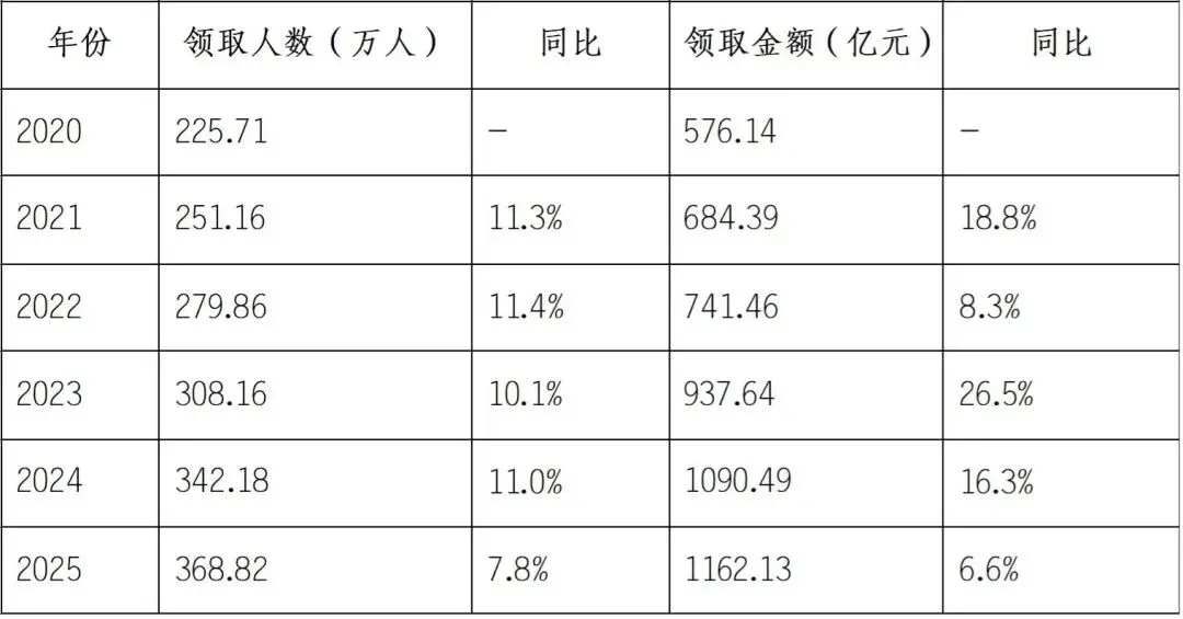 2021—2025年,企业年金领取人数由225.71万人增长至368.82万人,累计增长63.4%;领取金额由576.14亿元增长至1162.13亿元,累计增长101.7%,整体呈现出领取人数和领取金额同步扩张的态势。与制度运行初期相比,当前企业年金已明显进入领取规模持续扩大的阶段。