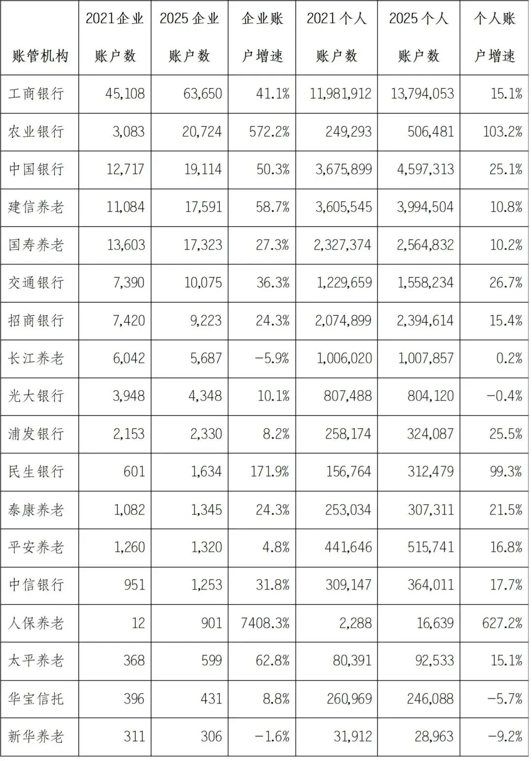2021至2025年,国寿养老、平安养老、工商银行连续五年稳居前三。按受托资产计算CR3,2021—2025年分别约为62.19%、62.28%、62.07%、62.00%、61.09%,前三家长期占据六成以上市场份额,市场集中度总体较高。