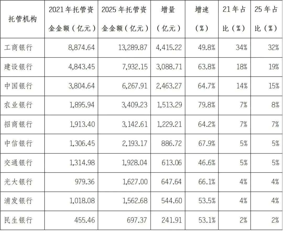 从2021—2025年的变化看,托管市场总体属于稳定型市场。头部机构市场份额虽有小幅变化,但并未改变国有大型商业银行占据主导地位的基本格局。前四大国有商业银行托管资产规模合计占比超过70%。托管业务呈现明显的规模效应,大型银行凭借广泛的网点覆盖、成熟的清算体系和机构客户基础,占据绝对主导地位。托管费率和综合服务能力成为竞争关键,部分股份制银行在局部区域和特定客户群体中形成差异化优势,但整体格局未发生显著变化。