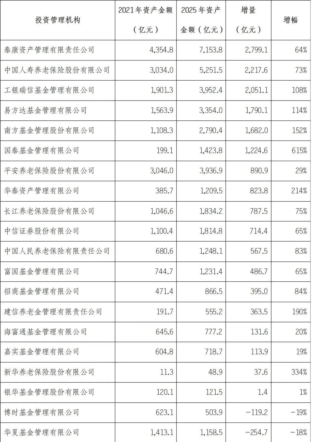 2021—2025年,投管人市场份额持续向投资能力突出的头部机构集中。泰康资产2025年管理规模达到7153.8亿元,显著领先,中国人寿养老、工银瑞信、平安养老、易方达构成第二梯队。总体看,投管市场头部优势延续,市场份额进一步向具备长期管理能力的机构集中。
