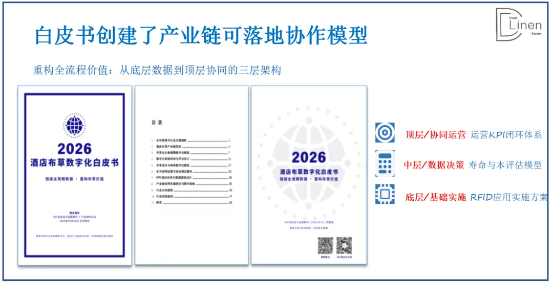 在方法论层面,白皮书创新性提出三层架构”的价值重构体系:顶层聚焦协同运营KPI闭环,推动酒店与洗涤、租赁等多方实现目标统一与效率提升;中层构建数据决策与评估模型,为运营优化提供科学依据;底层则以RFID等技术为支撑,打造可落地的数字化实施方案,真正实现看得见、管得住、算得清”。