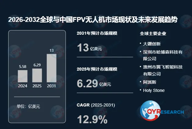 根据QYR(恒州博智)的统计及预测,2025年全球FPV无人机市场销售额达到了6.29亿美元,预计2031年将达到13亿美元,年复合增长率(CAGR)为12.9%(2025-2031)。