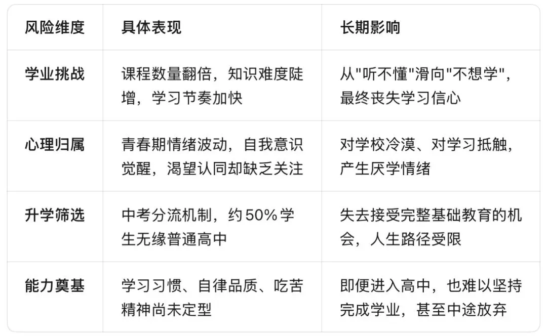 1.1 初中教育的特殊性与紧迫性许多家长对初中阶段存在认知误区,认为初中仅是"多读几门课、长大几岁"。事实上,初中是孩子学习生涯中最易掉队、最易迷茫、最易产生放弃心理的高风险阶段。具体表现为以下四个维度:
