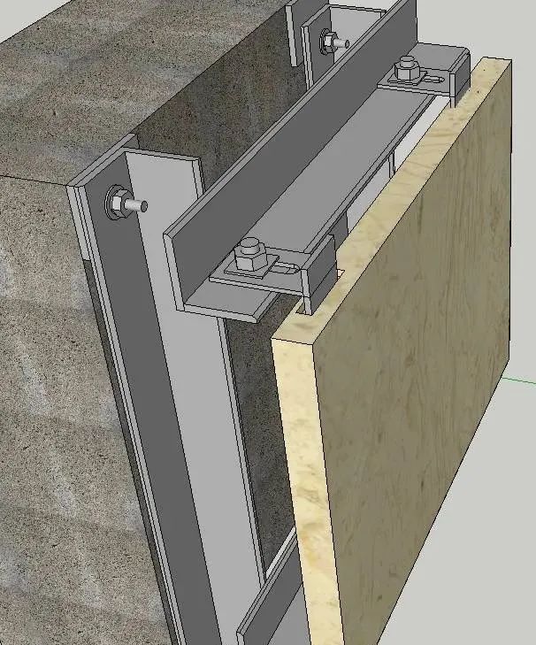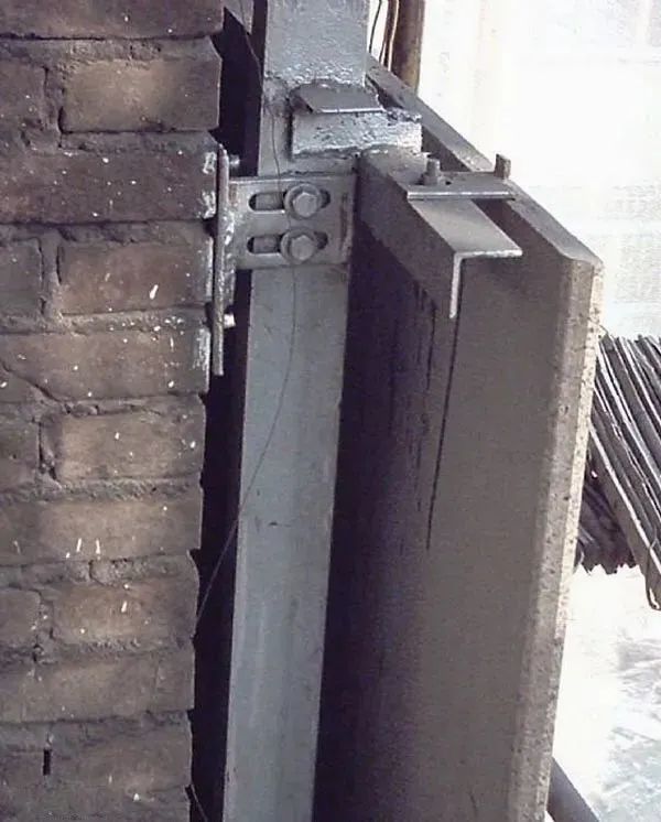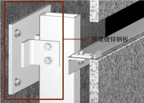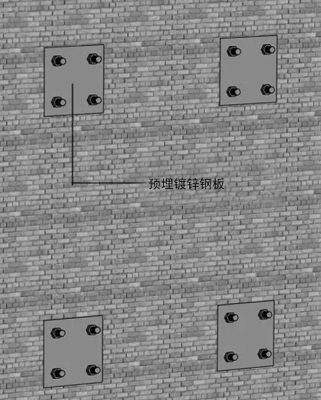 按照竖龙骨槽钢位置,确定预埋镀锌钢板位置,在混凝土梁、墙上用膨胀螺栓固定埋板。