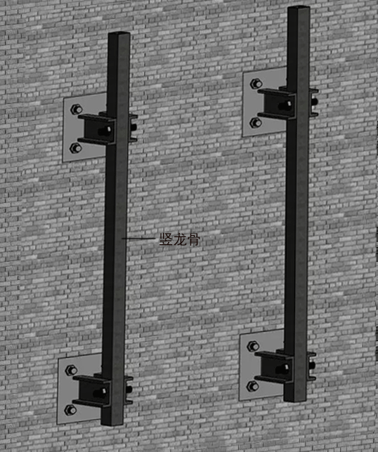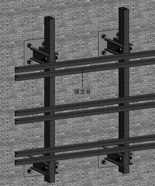 B、横龙骨采用镀锌角钢,间距视石材规格而定,与竖龙骨满焊连接。