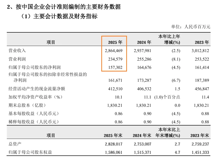 按照中国企业会计准则,中石油2025年实现营业收入高达28,644.69亿元人民币,虽然体量惊人,但同比出现了约2.5%的下滑。在盈利能力方面,其归属于母公司股东的净利润(简称“归母净利润”)约为1,573.02亿元人民币,同比也下降了约4.5% 。