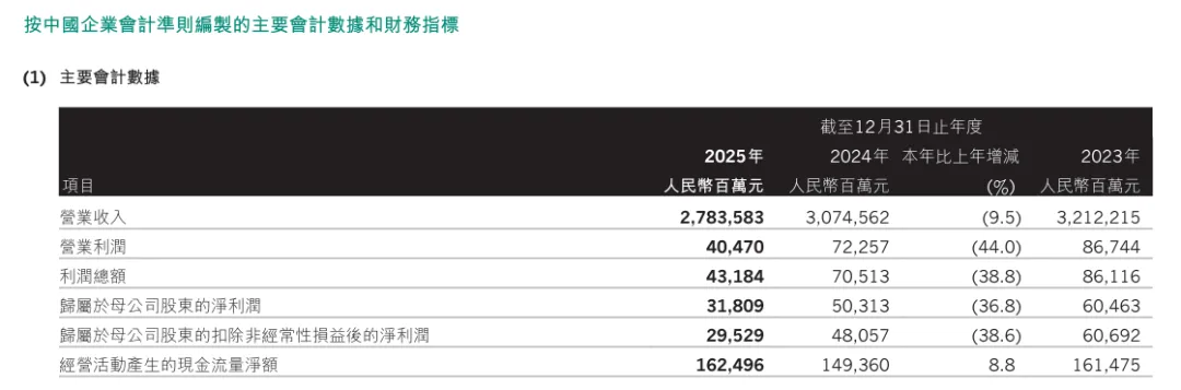 数据显示,2025年,中国石化实现营业收入27835.83亿元,同比下降9.5%;实现归母净利润318.09亿元,同比下降36.8%。