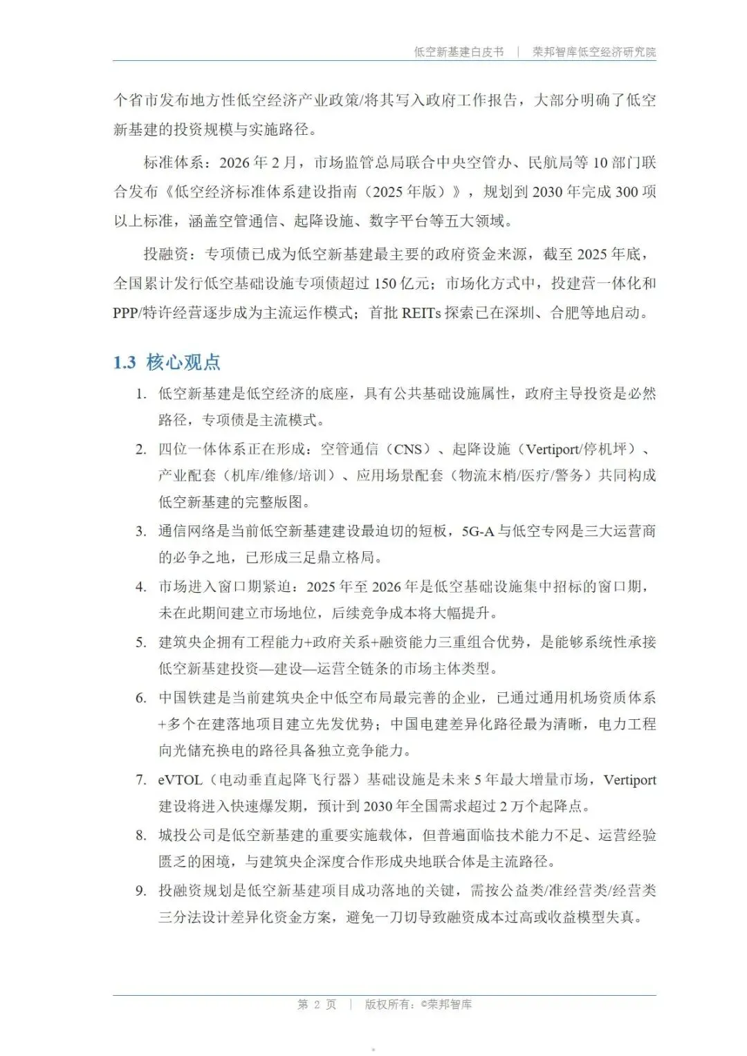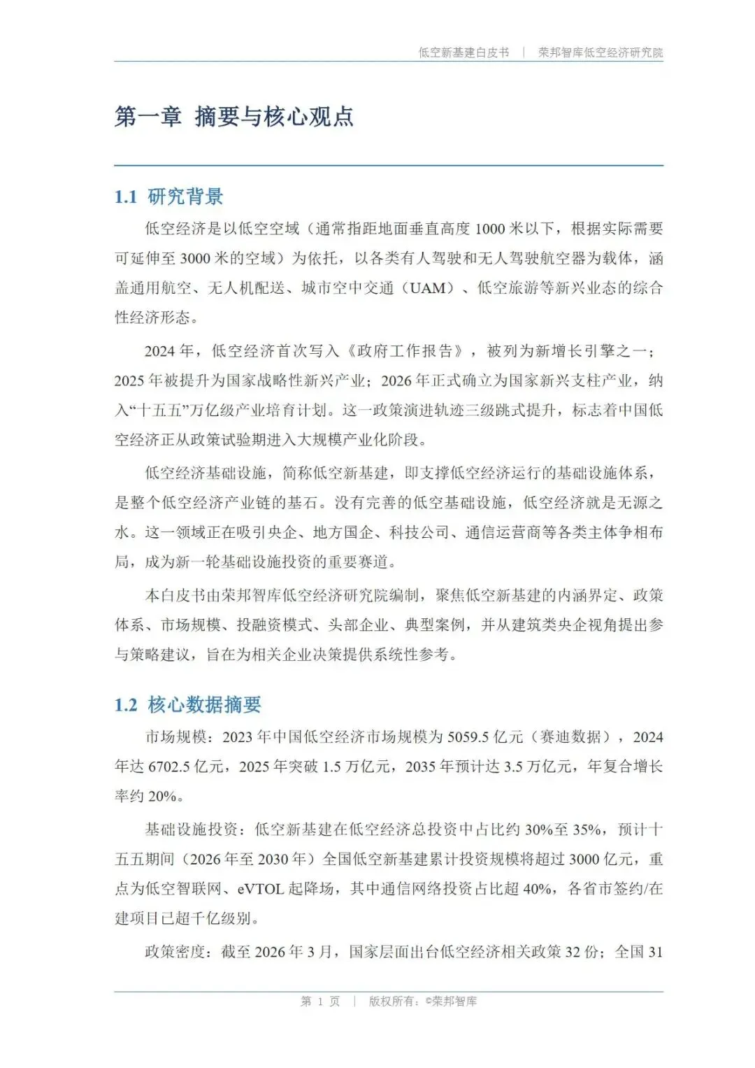 低空经济已成为我国战略性新兴产业与新兴支柱产业,低空新基建作为其核心支撑底座,正从政策试验阶段迈入大规模产业化建设期。本报告立足低空经济发展全局,系统界定低空新基建内涵与外延,梳理国家及地方政策演进、标准体系建设进程,测算市场规模与投资潜力,剖析投融资模式、市场竞争格局与典型落地案例,直面顶层设计、商业模式、技术标准、安全管控、资金保障等现实挑战,预判产业发展趋势,并针对建筑类央企提出参与路径与策略建议。报告依托公开数据、行业调研与实操经验,全面呈现低空新基建发展全貌,为产业参与者、投资机构与政策制定者提供客观参考,助力低空经济高质量发展与万亿级产业培育目标落地。