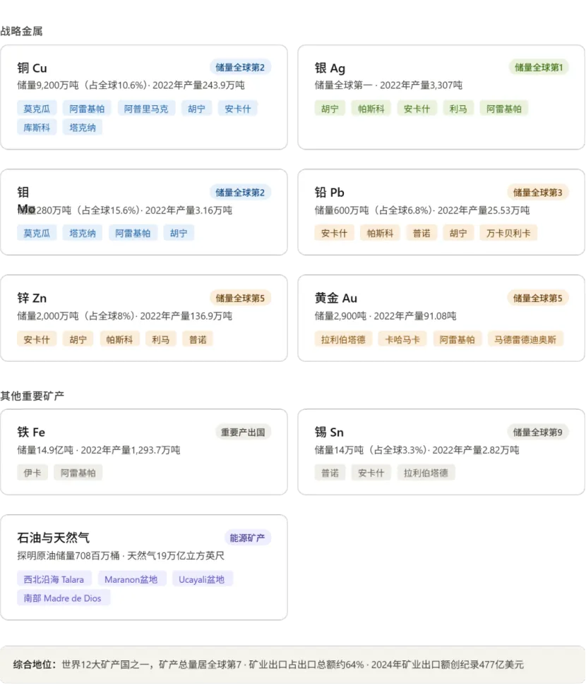 根据美国地质调查局(USGS)最新数据,秘鲁拥有全球10.2%的铜储量、3.9%的黄金储量、21.8%的白银储量、8.7%的锌储量、5.2%的铅储量及3.1%的锡储量。这使秘鲁在铜、银产量上长期位居全球前三,在锌、铅、锡、钼方面亦跻身全球前五。