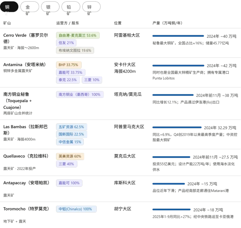 Antapaccay(Espinar矿区) | 运营方 | Glencore 100%控股运营,年产铜约18–22万吨 |