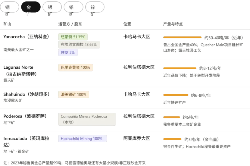 ·卡哈马卡大区(Cajamarca):Yanacocha金矿(Newmont运营,南美最大金矿),黄金开采历史悠久。