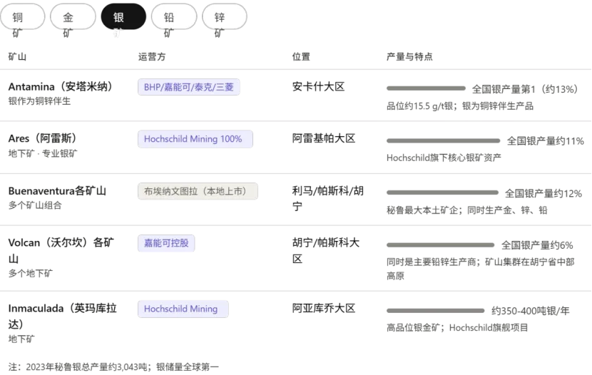 ·安卡什大区(Ancash):Antamina多金属矿(铜锌银铅,BHP/Glencore/Teck/三菱联合持股),使用南美最长矿浆管道运输至Huarmey港。