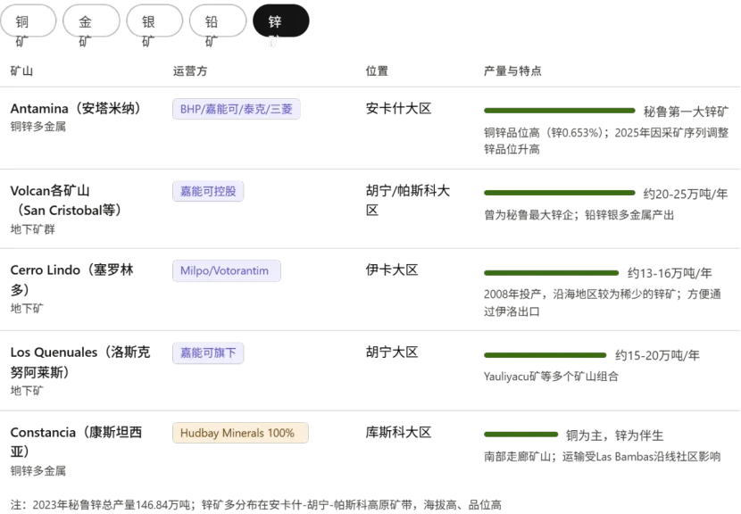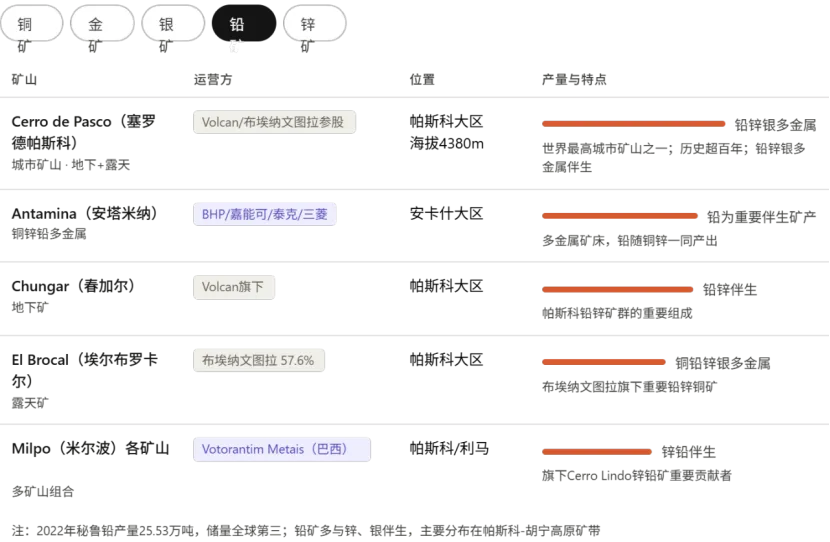 ·帕斯科大区(Pasco)和利马大区(Lima):多金属矿(铅锌银铜),Volcan、El Brocal等公司在此运营。